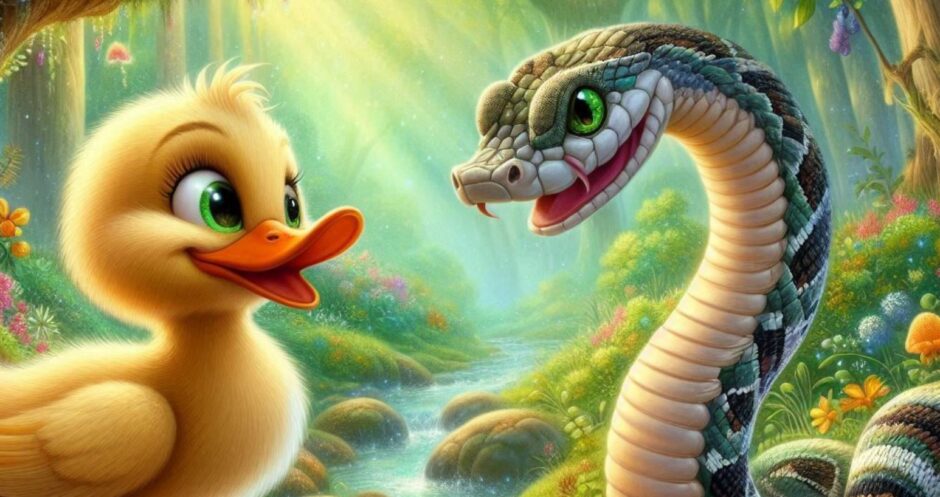 Sie schlängelte sich auf die Ente zu, bereit zuzubeißen, und die Ente hatte keine Kraft mehr, um fortzuwatscheln. »Du darfst mich nicht fressen«, jammerte die Ente, »das wäre nicht gerecht.«