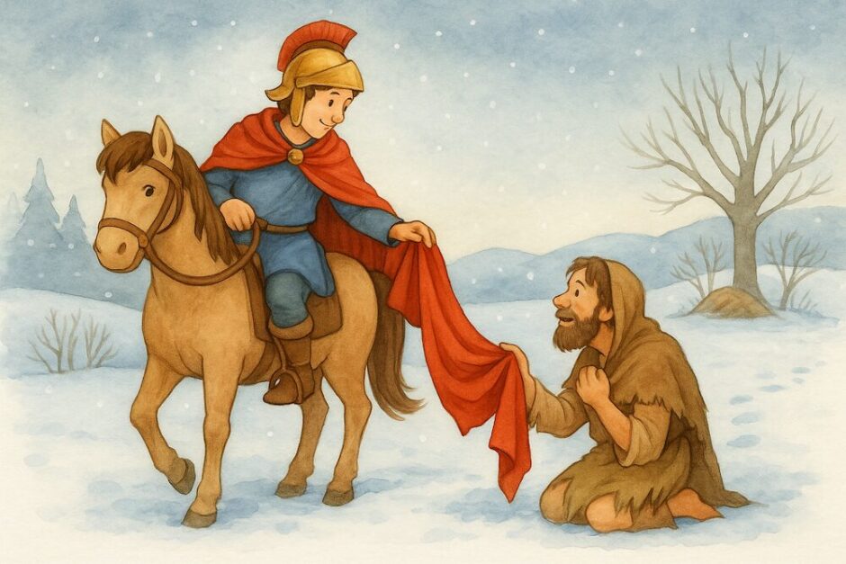 Aber was sollte er tun? Außer seinem Soldatenmantel hatte er ja nichts. Also nahm er sein Schwert und teilte den Mantel mitten entzwei. Den einen Teil gab er dem Armen, in den anderen Teil hüllte er sich wieder selbst. Etliche der Umstehenden begannen zu lachen, denn Martin sah mit dem halben Mantel kümmerlich aus. Viele jedoch, die mehr Einsicht hatten, bedauerten sehr, dass sie nicht selbst geholfen hatten, zumal sie viel wohlhabender als Martin waren und den Armen hätten bekleiden können, ohne sich selbst eine Blöße zu geben.